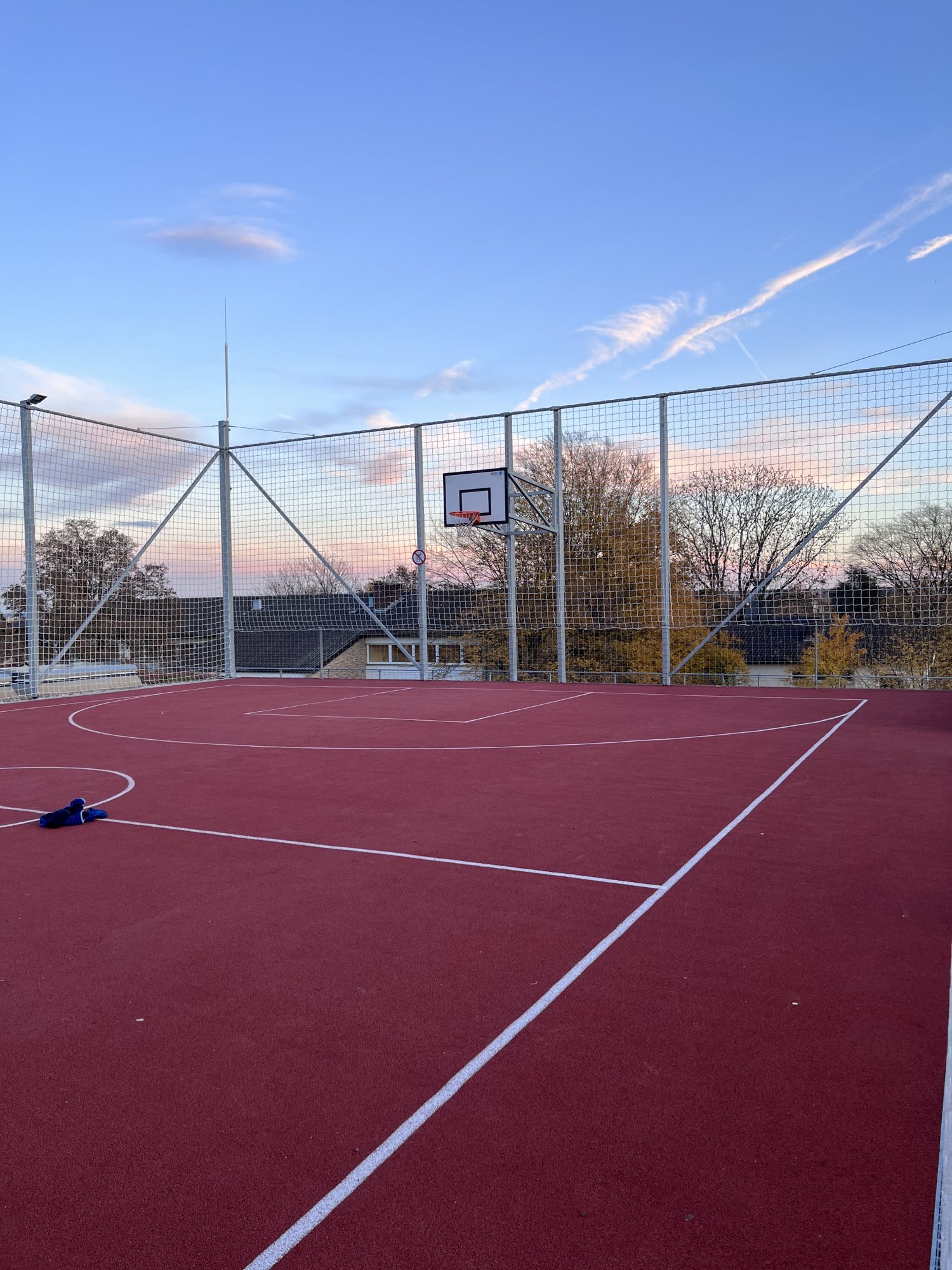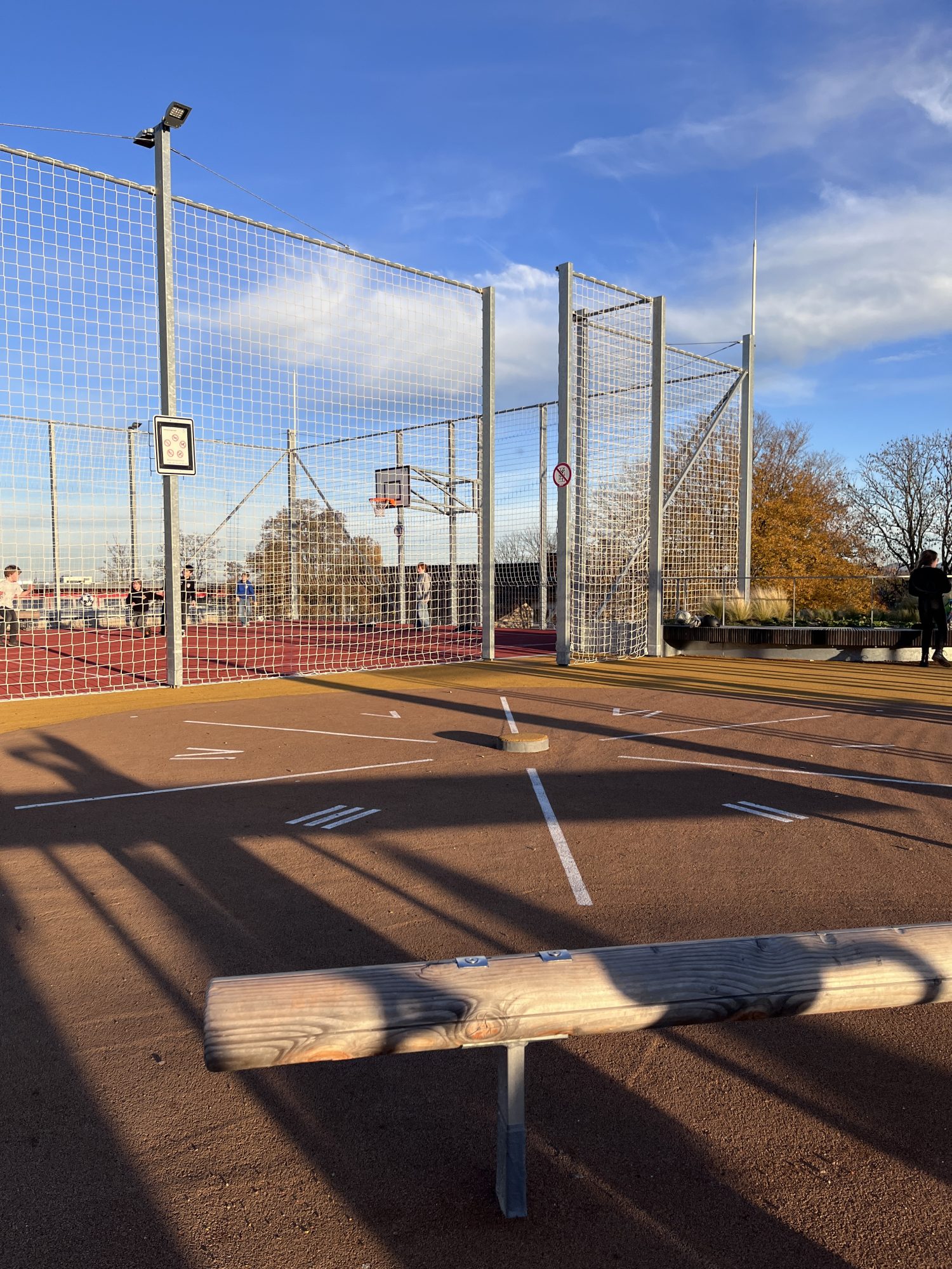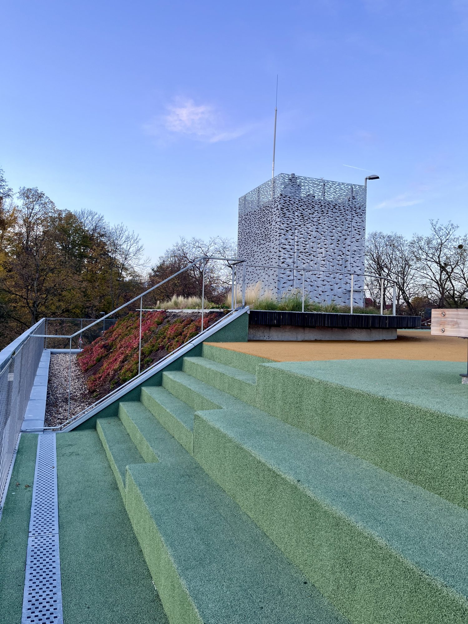 Die Spielfläche auf dem Dach ersetzt den Bolzplatz. Ballspielfeld und Calisthenics-Geräte adressieren Jugendliche. Kinder finden offiziell Spielmöglichkeiten auf dem Schulhof der Grundschule, doch an einem Dienstagnachmittag Anfang November zieht es alle in die Höhe zu den letzten Sonnenstrahlen. Eltern sitzen auf den Bänken am Rand der Hochbeete, sie haben die kleineren Kinder im Blick, die hangelnd, klettern, baumend und balancierend die zum Krafttraining gedachten Geräte in Beschlag genommen haben, andere kicken oder toben auf dem federnden Sportboden. Die Größeren spielen Basketball oder nutzen die Diskretion der Haha-Sitzstufen an der Dachkante. Spuren von Vandalismus sehen wir nicht, nur an der Ecke, wo ab und zu mal jemand einen Ball aus dem Graben fischen muss, hat die Begrünung auf der Schräge ein wenig gelitten. Eine robustere Anpassung ist bereits geplant, ein wenig Nachjustieren bei einem so experimentellen Bau ist durchaus legitim. Ulrich Königs ist sichtlich erfreut, dass oben wie unten so viel los ist und dass das Konzept nicht nur konstruktiv aufgegangen ist, sondern einen starken Beitrag zur Belebung des Alfterer Ortskerns leistet. Mutige Umsetzung, die nicht am Standardregelwerk scheitern, wünscht man sich viel häufiger – insbesondere im urbanen Kontext, wo öffentlicher Raum noch viel kostbarer ist.