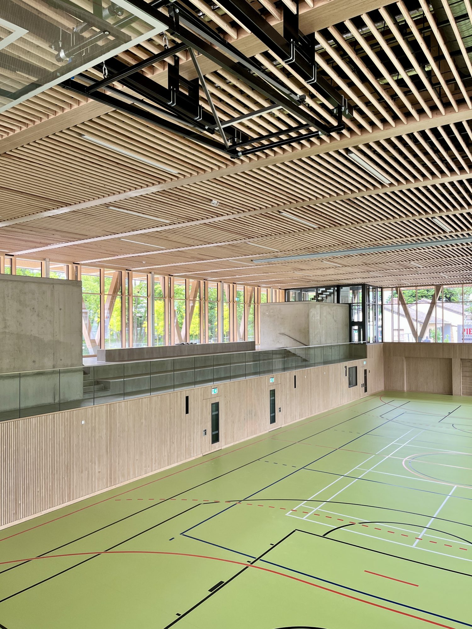 Ilse und Ulrich Königs sind als Kirchenbauer bekannt, die Konstruktion kathedraler Räume beherrschen sie auch im Säkularen. Dass Sporthallen standardmäßig als Black Box gebaut werden müssen, wollten sie nicht akzeptieren, insbesondere nicht, da in Alfter die Wiederbelebung des Zentrums daran geknüpft war. Die geforderten Nutzungen organisierten sie deshalb auf drei Ebenen: Die Eingangsebene wird über den Vorplatz schwellenlos erschlossen. Sie ist allseitig raumhoch verglast, das Foyer mit dem geplanten Quartierscafé und die Tribüne sind einsehbar. Das topografische Gefälle gen Schulhof gleicht ein Stahlbetonsockel aus, der das Gebäude U-förmig umfasst und vorne bodengleich ausläuft. Das Sportfeld (17 x 34 Meter) bietet auch Platz für Veranstaltungen mit bis zu 400 Personen und liegt mit Umkleiden und Nebenräumen vor Blicken geschützt ein Geschoss tiefer, profitiert jedoch von den gesamten sieben Metern Raumhöhe und dem einfallenden Tageslicht. Die Absenkung reduziert das Volumen des solitären Baukörpers erheblich und fügt ihn in den Maßstab des Stadtraums ein. Das Dach mit Ballspielfeld, Calisthenics-Geräten, Bänken und Pflanzungen bildet die dritte Ebene. Dieses Haus bietet vieles: Sport (unten) und Spiel (oben) können gleichzeitig stattfinden. Steht eine Gemeinde- oder Karnevalssitzung an, wird die Sporthalle zur Kulturhalle und das lindgrüne Linoleum mit einem in Rollen bereit gestellten Schutzboden geschützt.
