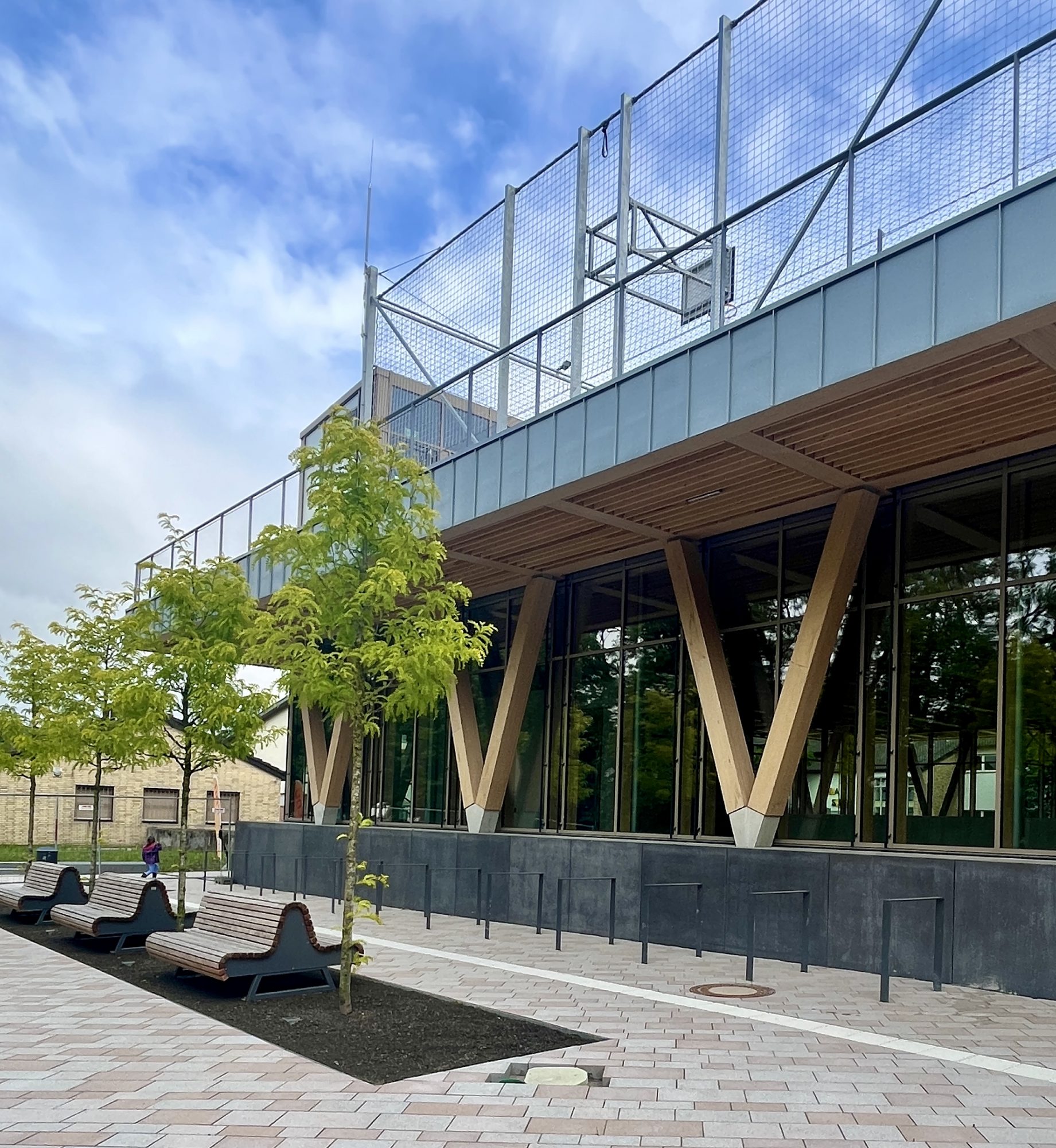In Alfter lagen die Nerven blank, als drei Kneipen gleichzeitig schlossen, und dann war auch noch die Turnhalle marode. In ihrer Not dachte die Kommune groß und erfand ihren gesamten Ortskern neu. Königs Architekten überzeugten 2019 in der im Rahmen des Integrierten Städtebaulichen Entwicklungskonzepts (ISEK) ausgelobten Mehrfachbeauftragung. Anstelle der zugeparkten Mitte sollte ein Grünzug mit unterschiedlich gestalteten Nutzungsbereichen vom Schlosspark herunter ins Zentrum geführt werden, räumlich gefasst von einem Vollsortimenter mit Tiefgarage und Wohnungen in den Obergeschossen sowie einer Kultur- und Sporthalle direkt neben der Grundschule. Interessant ist dabei das Zusammendenken der Funktionen, denn stapelt man Einkaufen mit Wohnen und kombiniert Kultur mit Sport, spart das Kosten und Flächen, die unversiegelt bleiben und öffentlich genutzt werden können. Kommt man heute nach Alfter, kann man im Zentrum Am Herrenwingert immer noch bequem parken. Für den Wohn-Einkaufsbaustein wurde Planungsrecht geschaffen, ein Investor wird gesucht. Der Abriss des Bolzplatzes und der Neubau der im Sommer 2024 eröffneten Kultur- und Sporthalle an gleicher Stelle war ein kommunales Projekt (Baukosten 13,5 Mio € brutto). Eine geeignete Ersatzfläche für den Bolzplatz fand die Gemeinde nicht, wohl aber die Architekten, auf dem Dach. „Was wir uns technisch damit angetan haben, haben wir erst später festgestellt. Wir waren nämlich die ersten, die eine öffentlich nutzbare Fläche auf eine Holzbaukonstruktion legen wollten“, erinnert sich Ulrich Königs. So waren sie dann auch die ersten, die für Brandschutz, Entfluchtung und Entwässerung entsprechende Lösungen gefunden haben und zu den zwei Funktionen der Halle ist mit der bespielten Dachfläche noch eine dritte dazugekommen.